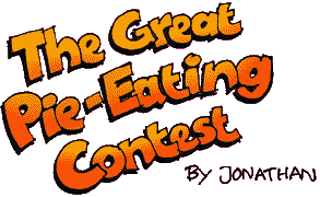 Jonathon had a reason for literally running this errand. He had seen the cooking things arranged on the kitchen table ready for use and guessed what the half-dozen eggs he was going to buy would be used for. It might be a cake, or a pie, or cookies or something else. Whatever, Jonathon didn't care too much. He had his favorites and not-so-favorites, but food was food and Jonathon wasn't very fussy when it came to food. He licked his lips in happy anticipation as he ran, imagining what Aunt Celia might be about to cook. Another happy thought was that Aunt Celia had said that Jonathon could keep the change from this trip. Jonathon had been saving carefully and nearly had enough money to buy the new bearings he wanted for his skateboard. The change from this shopping trip, added to what he already had saved, would make just the right amount. Jonathon was so preoccupied with these happy thoughts that he at first barely noticed the community noticeboard in the window as he ran past it on his way to the shop door. Then, he stopped so suddenly that his sneakers skidded on the concrete pavement, making a screeching sound as he "put on the brakes" as hard as he could. Jonathon ran backwards a little way and read the large sign he had seen on the noticeboard. "Charity pie-eating competition for children" proclaimed the heading. Jonathon read the sign with growing interest as it described the time, place, entry fee and prize. The entry fee was nearly the same as he would have to spend for the bearings, but the prize money would be worth it - if he won. Jonathon considered his options. If he won, there was no problem. If he didn't, his money would be gone, but he could eat as much as he wanted. The pies were being donated by a local bakery. His skateboard didn't really need new bearings anyway. It would go faster with new bearings, but it was okay as it was now. Jonathon continued to think about the competition as he went inside the shop to buy the eggs. By the time he came out of the shop, Jonathon had made his decision. * * * * * Aunt Celia began mixing ingredients in a large bowl as she listened to Jonathon eagerly describing the competition. Jonathon ended his description with the earnest entreaty, "can I go in for it, Aunt Celia? Can I? Please?" "What about the entry fee, dear? You know I can't pay for it." Aunt Celia was a very practical young woman. "That's okay, I can use the money I was saving for the skateboard bearings. Can I enter, please Aunt Celia?" There was a pause in the discussion while Aunt Celia checked her recipe book before adding more ingredients. Jonathon knew from experience that harassing his aunt would not help matters, so he turned a chair around and sat down, crossing his arms on top of the back of the chair and resting his head on them. Even though he was feeling very impatient, Jonathon kept quiet and waited, thankful that his aunt wasn't like so many of the other adults he had known. They would say "I'll think about it" and then forget all about it or they would just say "no" automatically, without even thinking about saying "yes"; but Aunt Celia would actually think, even while she seemed to be fully occupied with other things. Many times, Aunt Celia would ask more questions before delivering a firm verdict, either yes or no. You could be sure of a fair hearing when dealing with Aunt Celia. Aunt Celia began mixing again as she resumed the conversation. "Dear, I know that you usually eat two more pancakes than Randy..." "...three," interrupted Jonathon, stoutly, "I can eat three more pancakes than Randy!" Aunt Celia tried not to smile. "...but I'm not sure you realise just how difficult it will be for you to win an eating competition like this," she continued. "You're quite... skinny, you know..." "...only because I exercise a lot" interrupted Jonathon again. "Please, Aunt Celia? I really want to go in for it!" There was another pause in the conversation while Aunt Celia thought some more, mixing the ingredients in the bowl while she thought. "Get an entry form," said Aunt Celia at last, "and I'll read it and decide for sure then." "Okay," said Jonathon, bouncing up from the chair he had been sitting in, "right now?" "If you like," smiled Aunt Celia. Without hesitation, Jonathon darted for the door, pausing only long enough to shout, "okay, be back soon" while grabbing his skateboard on the way out. Aunt Celia smiled a wry smile as the door banged behind Jonathon. He certainly was a handful and a half to manage, but his enthusiasm for life seemed to be infectious and often infected Aunt Celia to good effect. She began to hum a tune while she continued with her cooking. * * * * * * On the day of the competition, Jonathon was among the crowd of children who had gathered to participate. Aunt Celia had seemed a little reluctant at first, but after reading the competition rules and thinking about it for what was to Jonathon a nerve-wracking five hours, had finally signed the permission slip. So there was Jonathon, gathered with the other competitors and with Randy along for moral support (as well as - according to Randy - to "borrow a wheelbarrow to wheel him home in after")